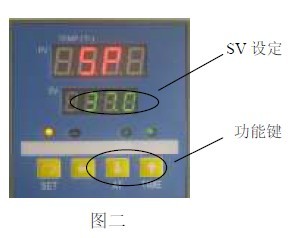 3.1 (見圖二)按一下“SET”鍵,此時PV 屏顯示“ ”,SV 屏顯示設(shè)定溫度值;