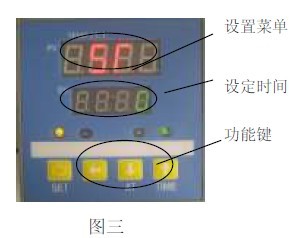 4.1 見圖三,按SET 鍵4 秒后,PV 屏顯示“ ”字符時,若SV 屏顯示“0”,表明未設(shè)定定時功能(出廠狀態(tài))