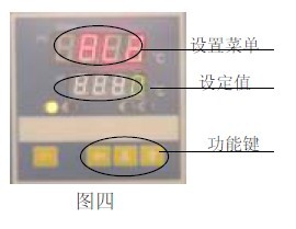 6.2(見圖四)當(dāng)溫度到達(dá):PV = SV + AL2時,即從高速轉(zhuǎn)為低速運轉(zhuǎn),此時黃燈熄滅。