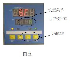 7.1.1 按“SET”鍵4 秒鐘以上(進(jìn)入B菜單),當(dāng)PV屏顯示“ ”即放開,再按SET鍵若干次,找到“L K”提示符(見圖五);