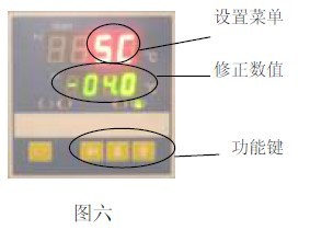 7.1.3 (見圖六)再按“SET”鍵若干次,找到所需要調(diào)整的控制參數(shù)的“SC”提示符,按功能鍵,使該控制參數(shù)顯示為所需要的值;SC = 原始SC值 +(實際溫度 - PV顯示值)