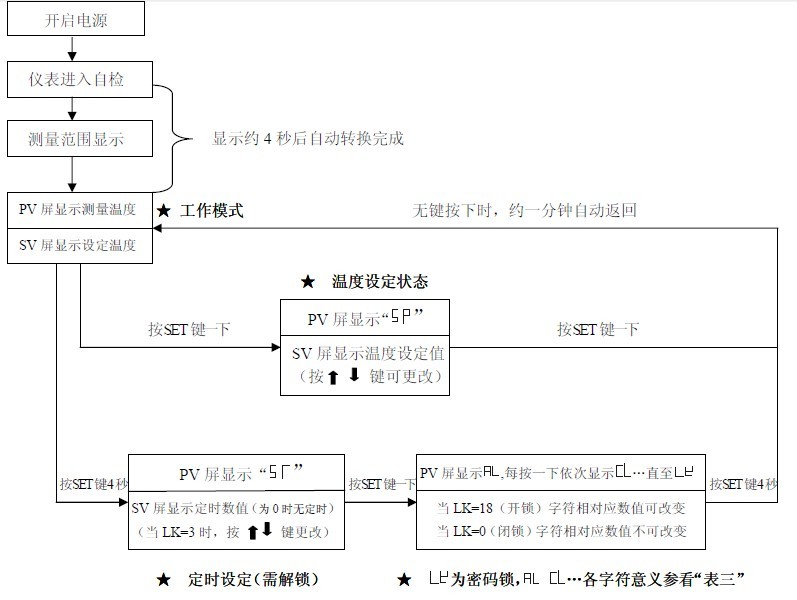 3.4 再按一下“SET”鍵,回到工作模式(PV屏顯示測量溫度,SV顯示設(shè)定溫度),進(jìn)入工作狀態(tài)。