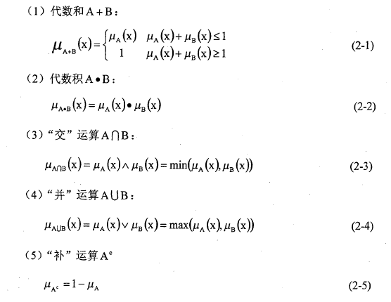 對模糊集合運(yùn)算時(shí),注意要有同等個(gè)數(shù)的集合元素參加運(yùn)算。模糊集合的運(yùn)算可分為代數(shù)運(yùn)算和邏輯運(yùn)算,主要有以下幾種: